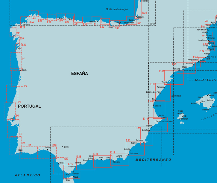 Overzicht papieren kaartensets van Spanje en Portugal (hiermede wordt een volledige dekking bereikt van de kustgebieden):
