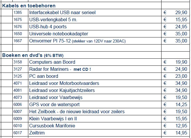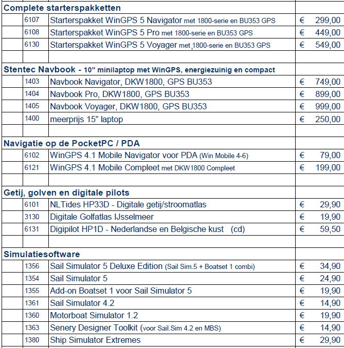 Als officiëel geauthoriseerde dealer van Stentec: de maker van de WinGPS navigatieprogramma's en digitale waterkaarten van geheel Europa leveren wij het gehele programma, alsmede de bijbehorende hardware. Daarnaast hebben wij onze eigen lijn van boord-PC's en boordlaptops, 12 volt touchscreen schermen in LED en TFT, voeingsadapters, enz. Onderstaand treft u een prijslijst 2012 aan met de belangrijkste producten uit het Stentec programma. Voor een overzicht van ons leveringsprogramma kijkt u op onze webwinkel: http://shop.b-bit.nl